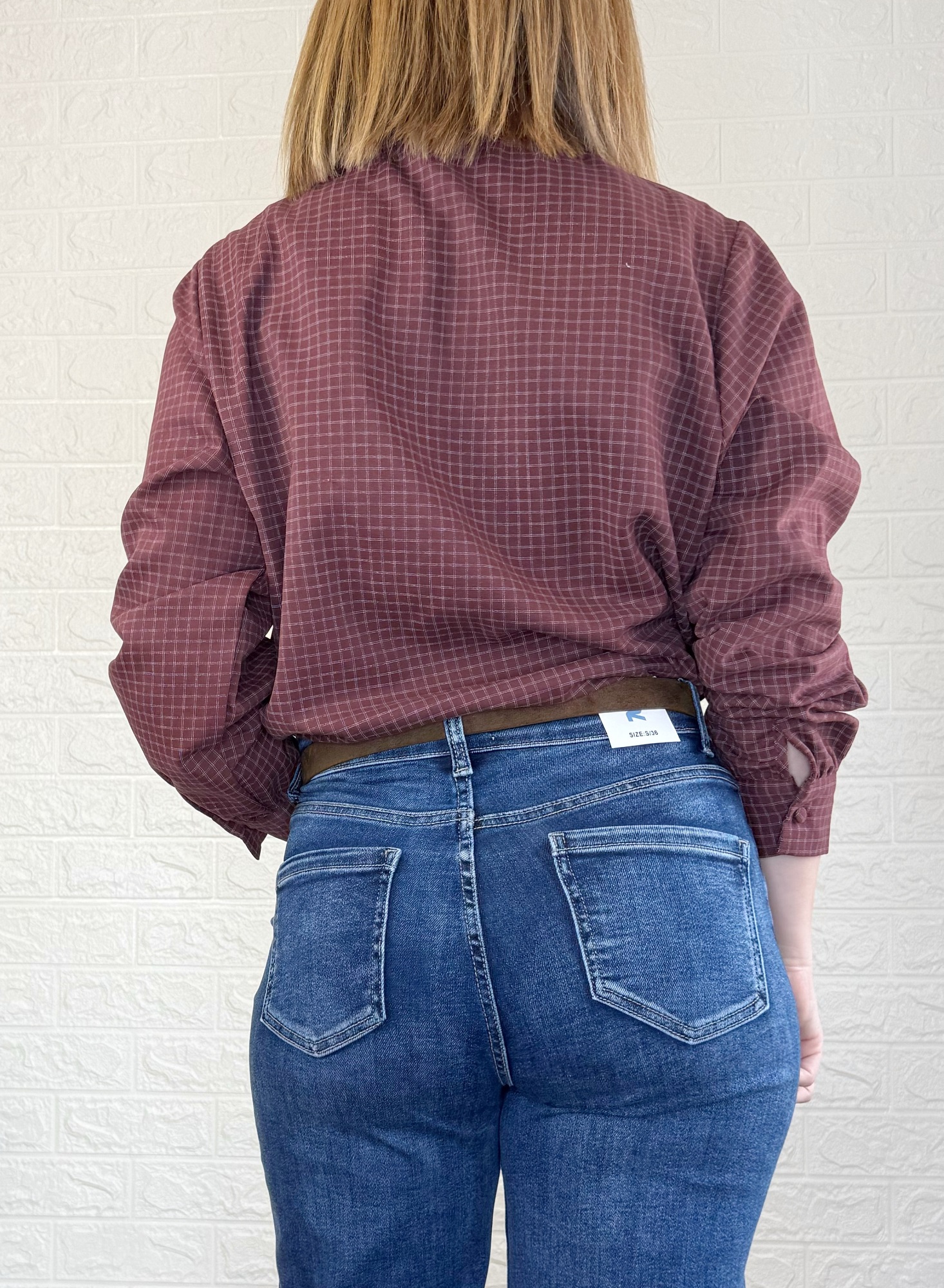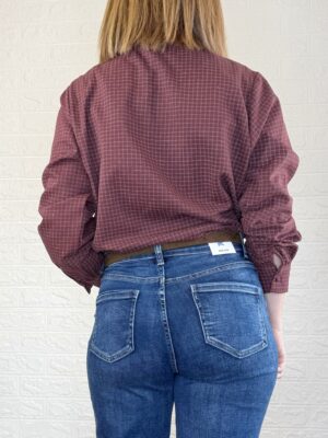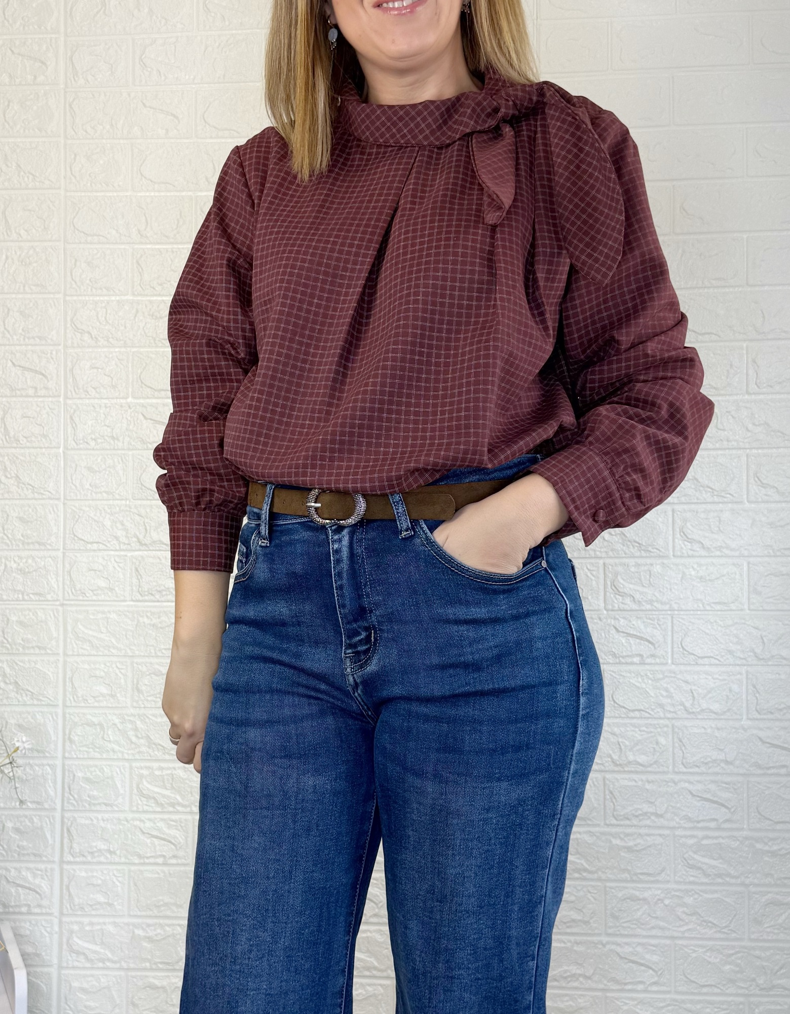 Blusa con estampado en cuadros, y detalle de lazada en cuello.