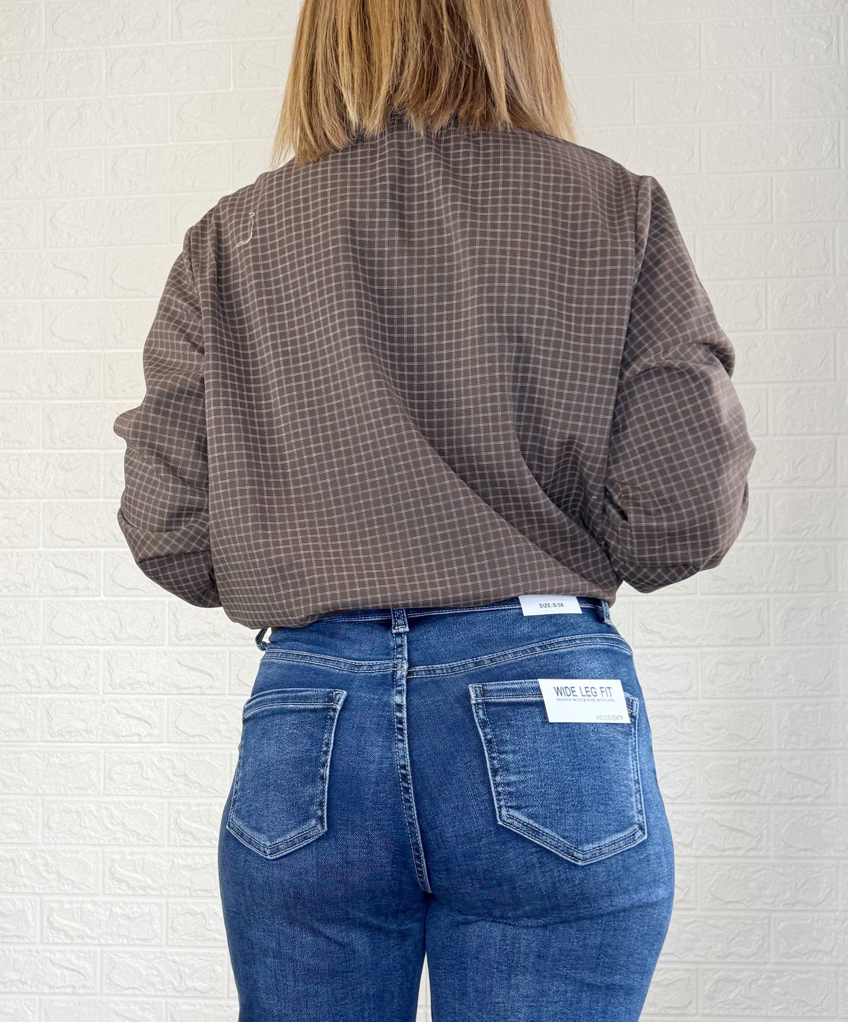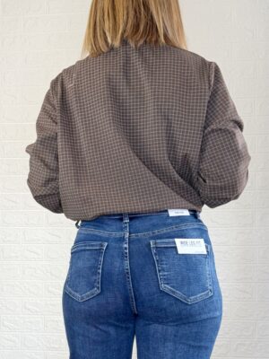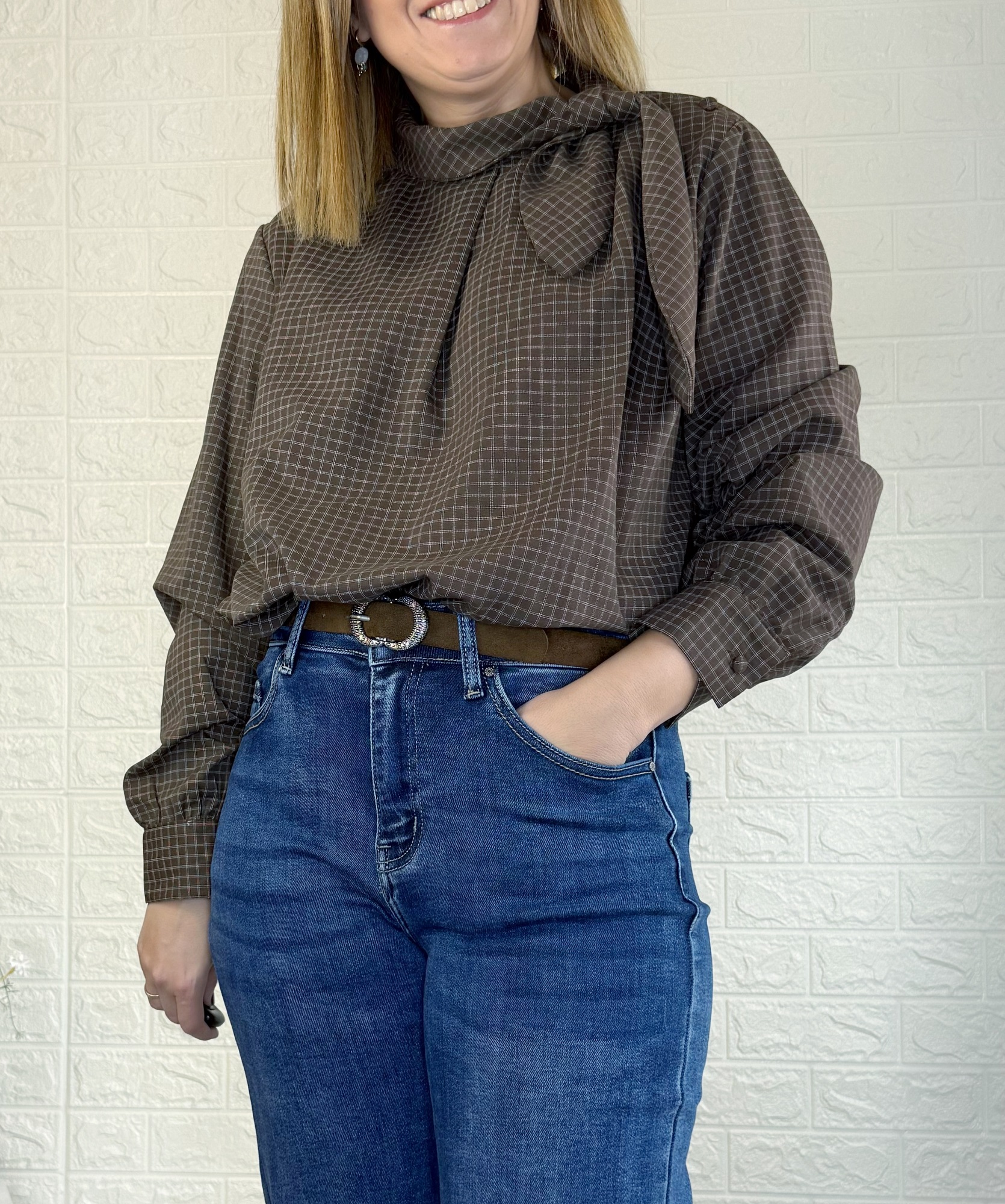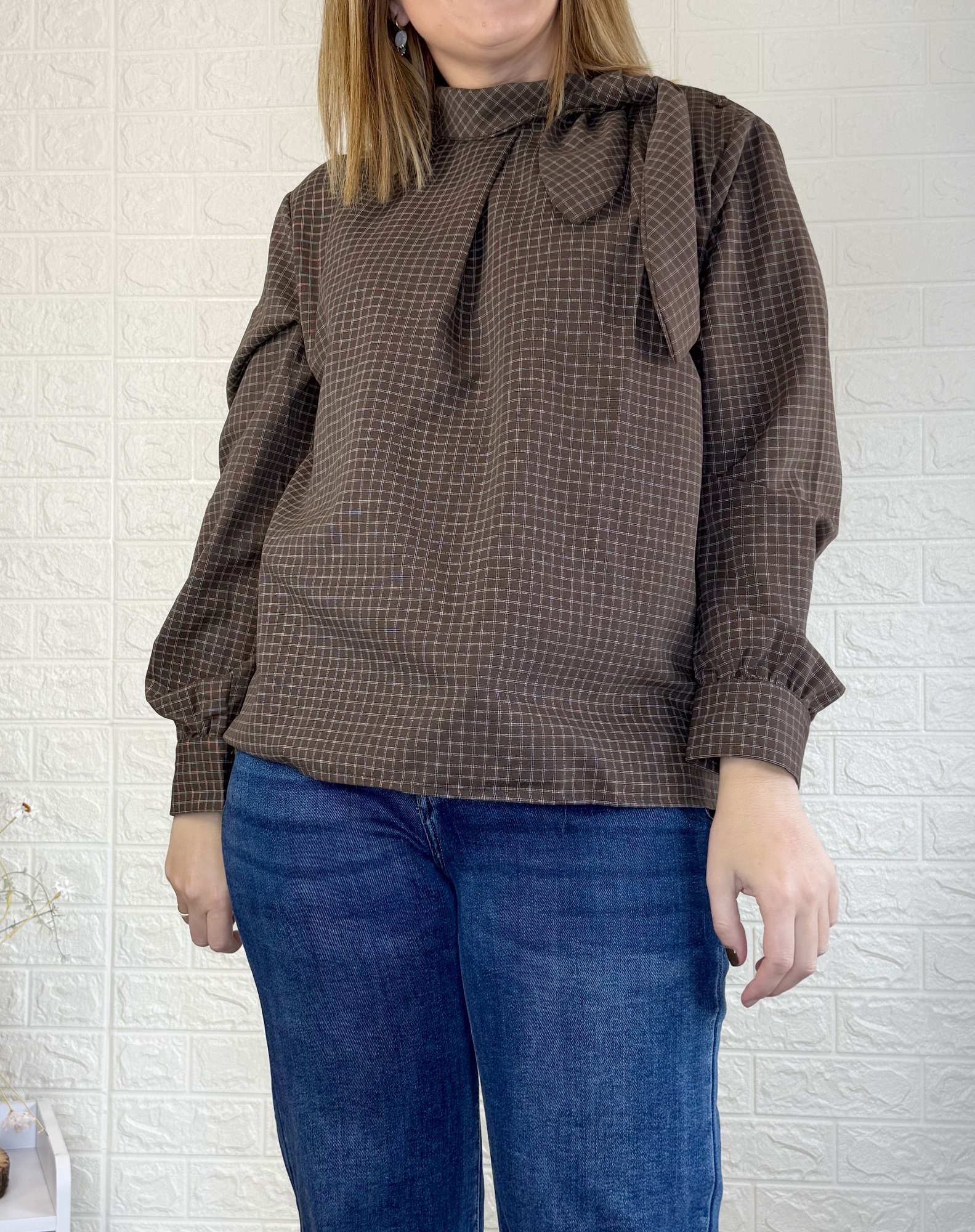Blusa con estampado en cuadros, y detalle de lazada en cuello.