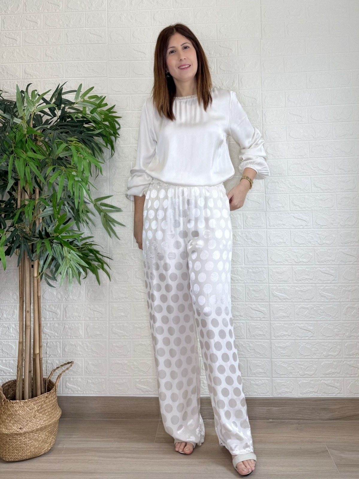Blusa manga larga con cuello redondo y detalle dorado en el cuello. Con goma en el puño.100% viscosaMedidasT. única: sisa 51 cm largura 63 cm