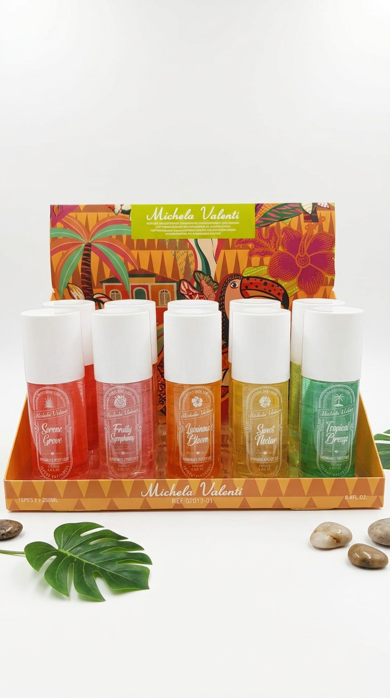 Naranja: Aroma cálido y veraniego con notas solares y dulces. Evoca la sensación de piel bronceada y días de verano. Perfecto para quienes buscan un olor alegre y luminoso.