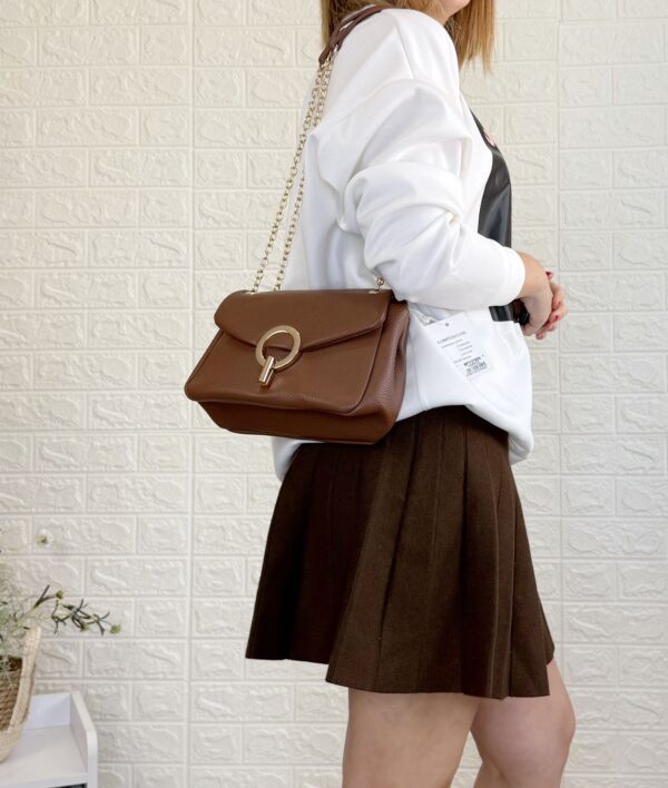 Bolso con solapa. Se puede llevar en el hombre o alargar el asa y llevar cruzado.