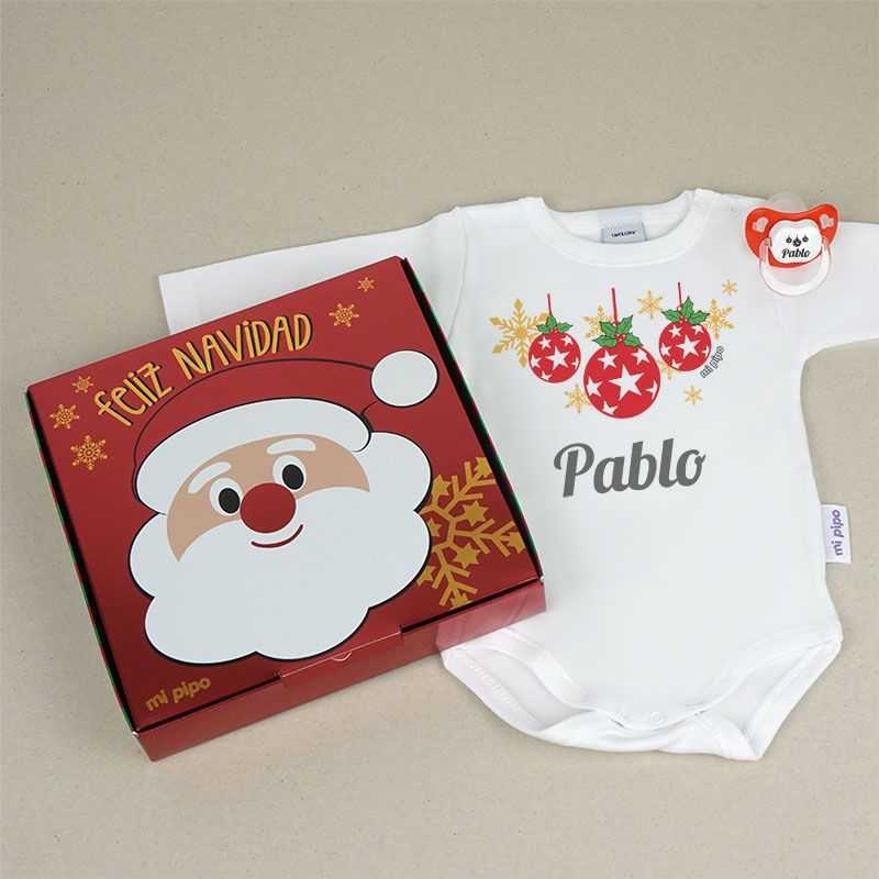 PONER EL NOMBRE EN OBSERVACIONES- Body Babidu blanco estampado con dibujo de Bolas navideñas – El nombre en el body va bordado.- Chupete Baby en color rojo personalizado con tetina a elegir.- Caja de regalo especial Navidad metalizada a elegir entre roja con Papá Noel verde con Reno Rudolf y roja con Papá Noel en catalán.- Personalización máximo 10 caracteres.