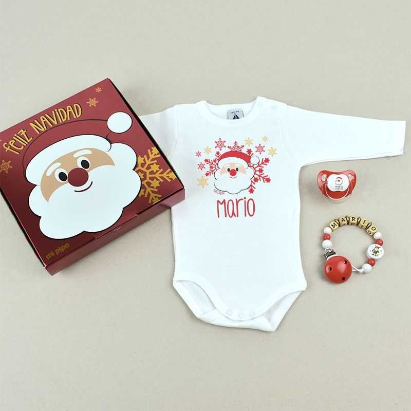 PONER EL NOMBRE EN OBSERVACIONESCONTENIDO:- Body Babidu blanco con Papá Noel personalizado talla 1 ó 6m- Chupete Baby Papá Noel color rojo personalizado con tetina a elegir- Cadenita de madera Papá Noel personalizada- Caja de regalo especial Navidad metalizada Feliz Navidad con Papá Noel- Personalización máximo 9 caracteres