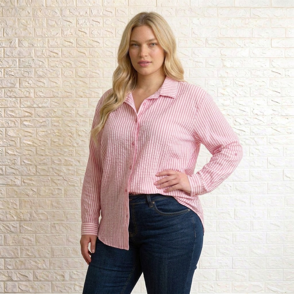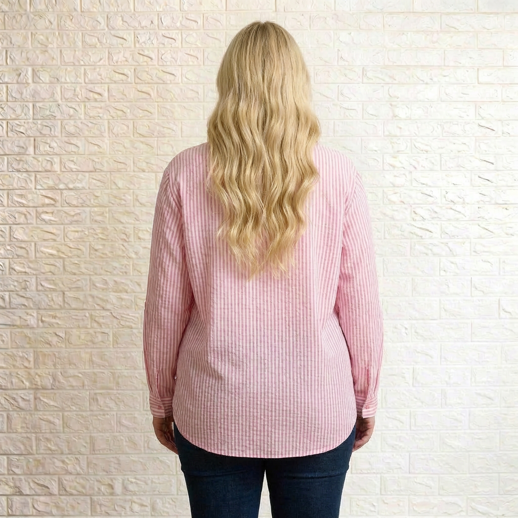 Camisa con botones. Estampado de rayas blancas y verde kaki