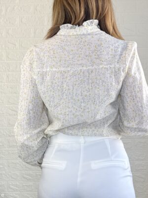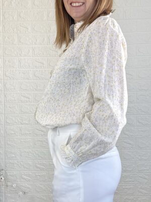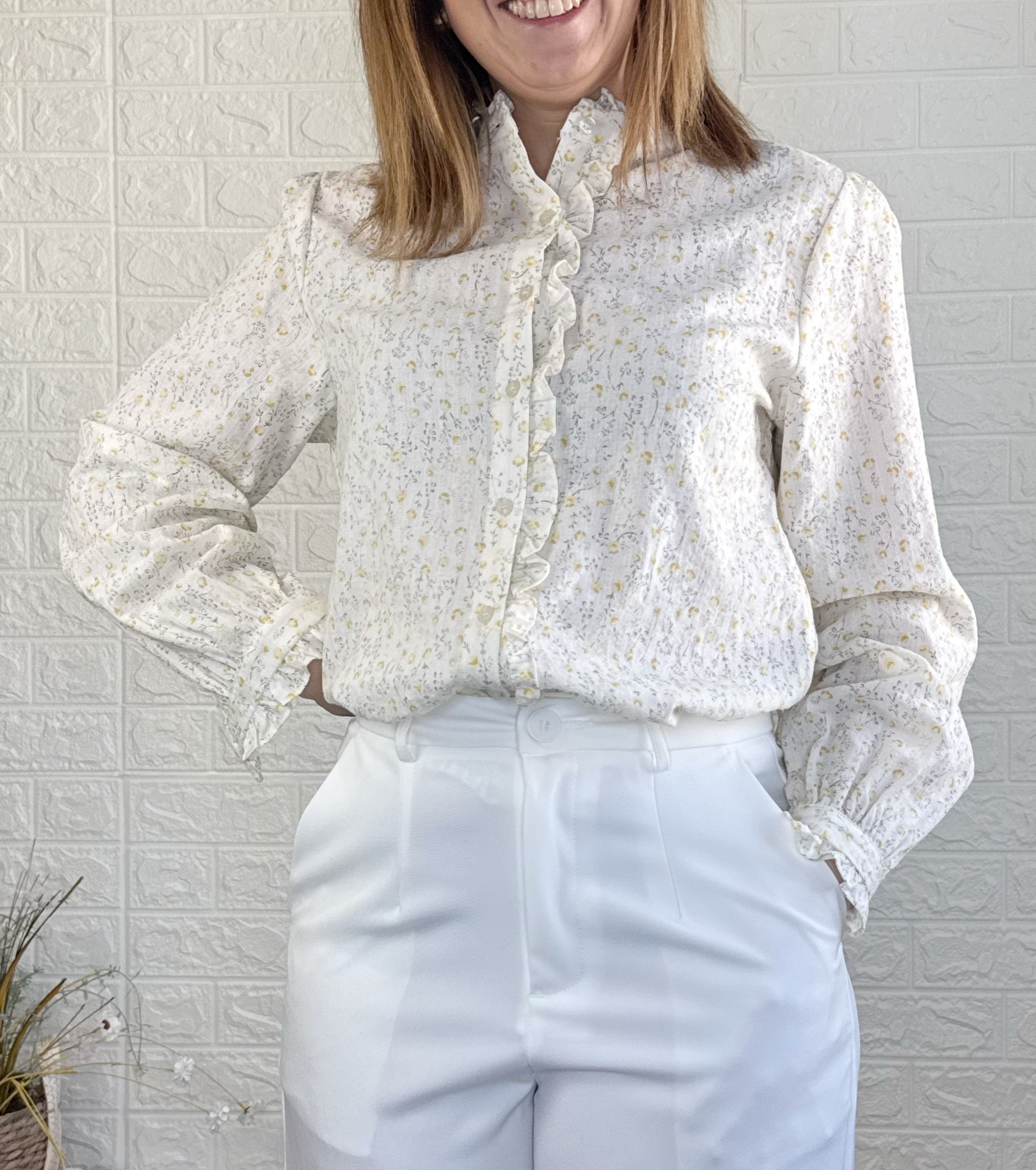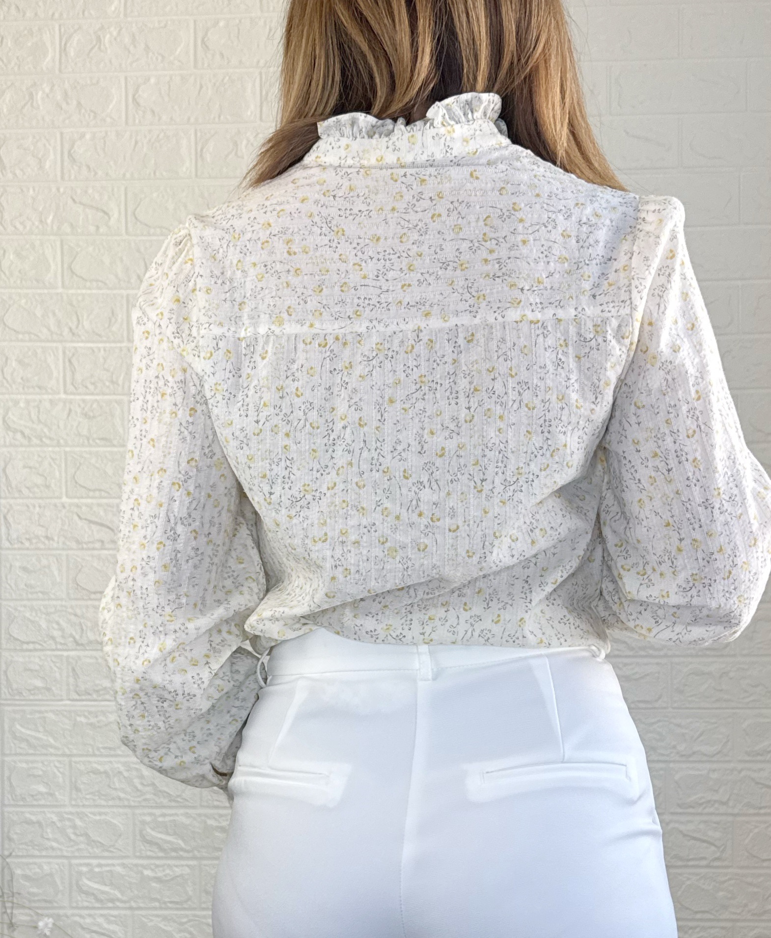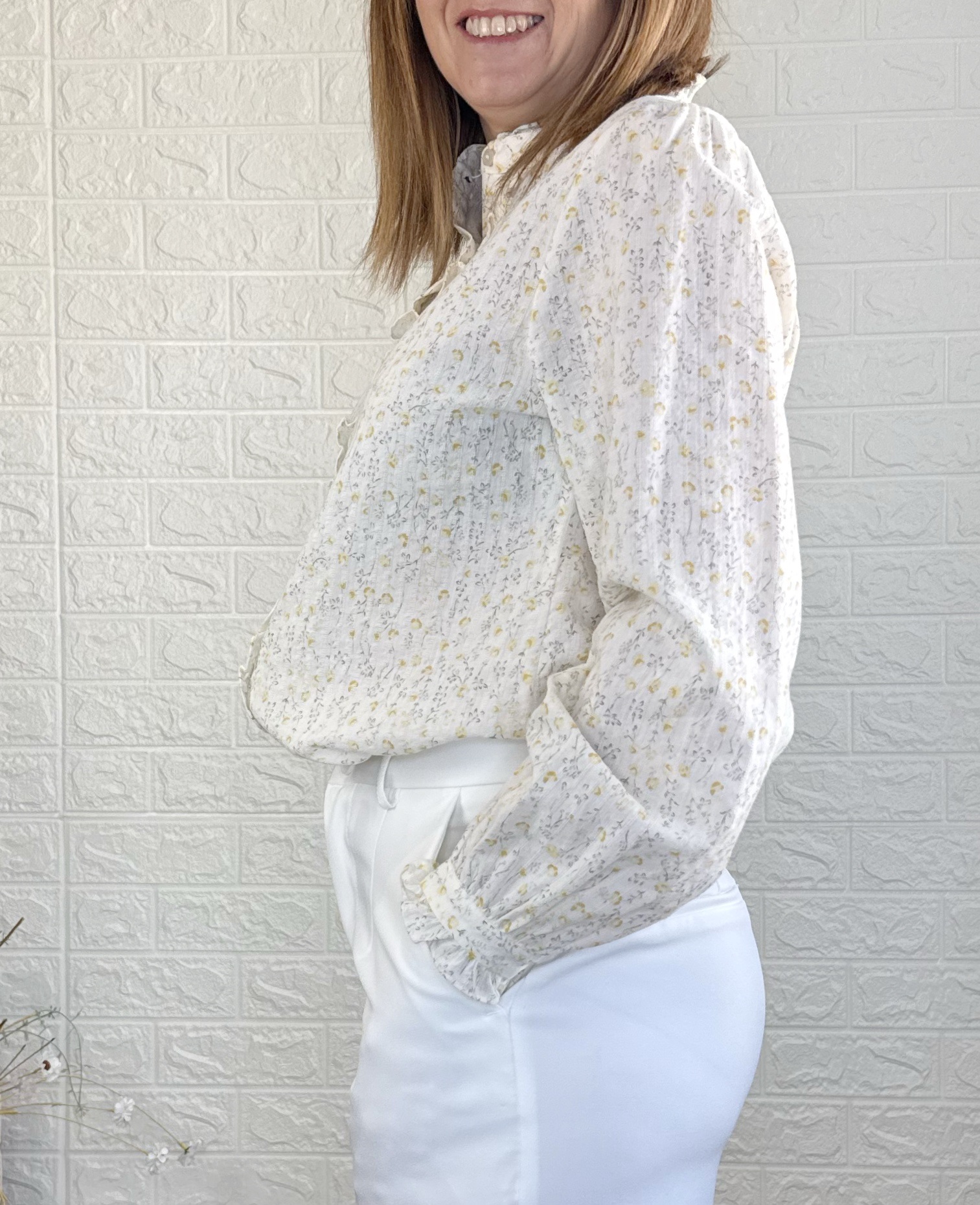 Camisa con botones. Estampado de flores amarilla con ramas verdes.