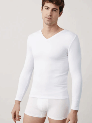 Camiseta interior térmica de manga larga y cuello pico, diseñada para aportar calidez y confort sin añadir volumen. El interior afelpado ofrece tacto suave y ayuda a retener el calor en días de frío moderado. Ideal para uso diario, actividades al aire libre o como base en looks formales e informales durante la temporada fría.