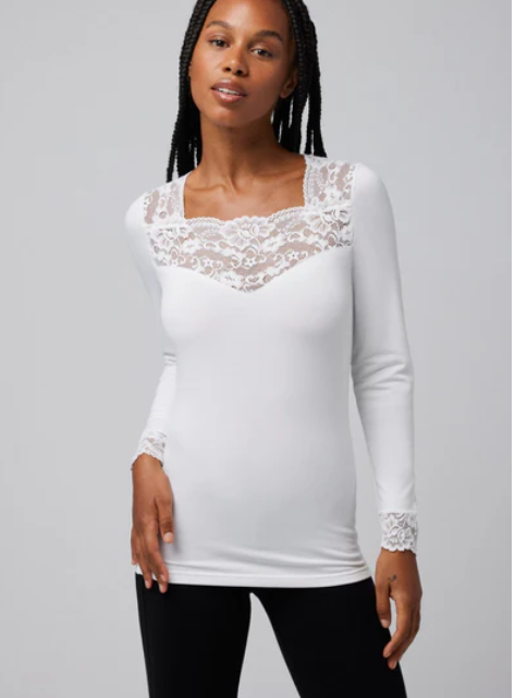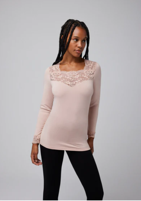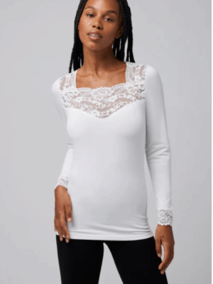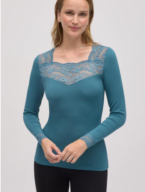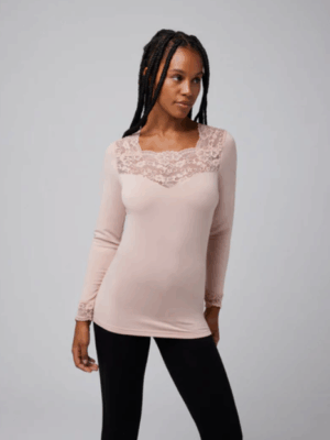 Camiseta térmica de manga larga para mujer con elegante cuello cuadrado y detalles de encaje en el escote y los puños. Confeccionada en tejido térmico suave, proporciona un nivel de termicidad que ofrece confort y calidez en días fríos sin sacrificar el estilo. Su diseño liso y femenino la convierte en una prenda versátil, perfecta para lucir como interior o como parte de un look casual invernal.