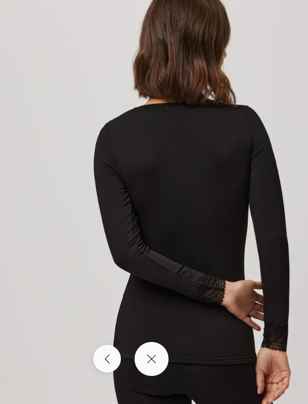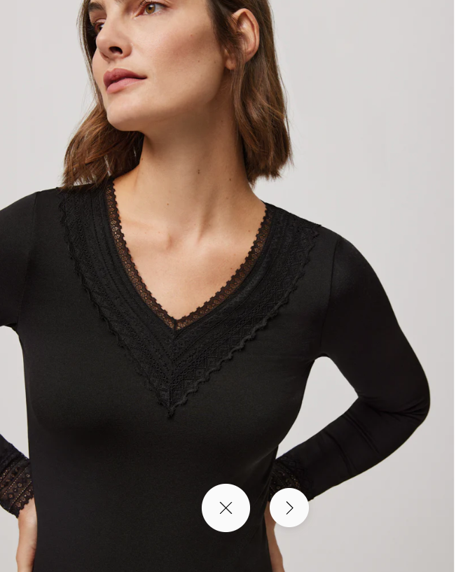 Camiseta de manga larga de cuello en pico. Con detalle de encaje en escote y puños. Confeccionada en tejido elástico suave y de gran adaptabilidad. Detalle de encaje en el escote. Modelo básico de gran confort pensado para el día a día es una prenda perfecta para los días más fríos y cálidos del invierno. Composición 92% Poliéster 8% Elastano