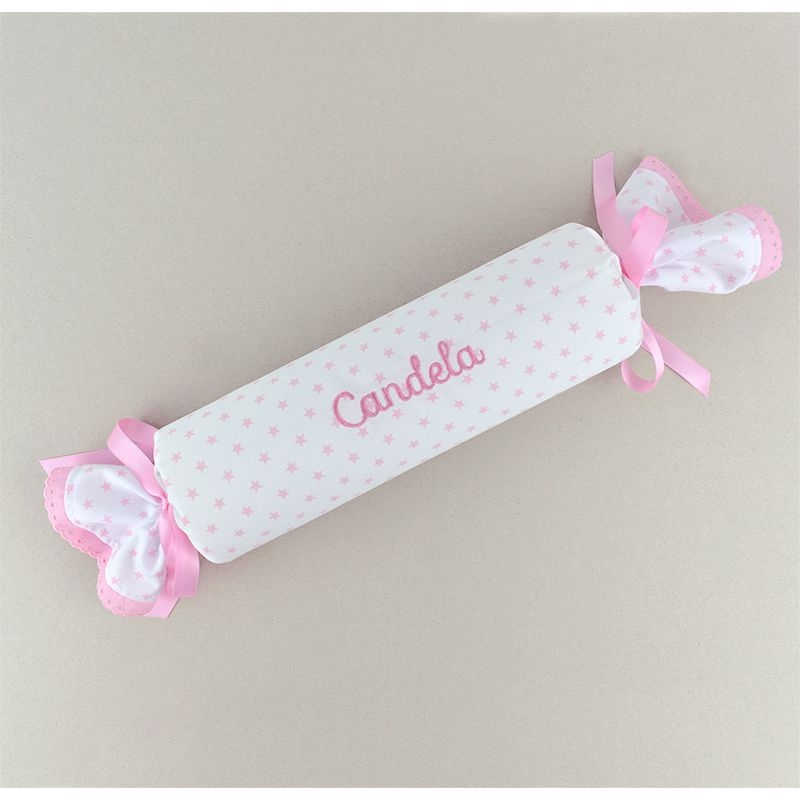 Cojin antivuelco caramelo estrellas rosa personalizado- Fabricado en España. Diseño original Mi Pipo- Tejido piqué 100% algodón- Desenfundable y lavable a máquina- Cierre de velcro- Relleno de espuma firme para posicionar al bebé- Acabado de puntilla y lazos de raso- Dimensiones 50x10cm- Se personaliza con el nombre bordado- Máximo 10 caracteres- Puedes personalizar el cojín con el nombre del bebé o con un texto como Princesa Príncipe o Mi Bebé