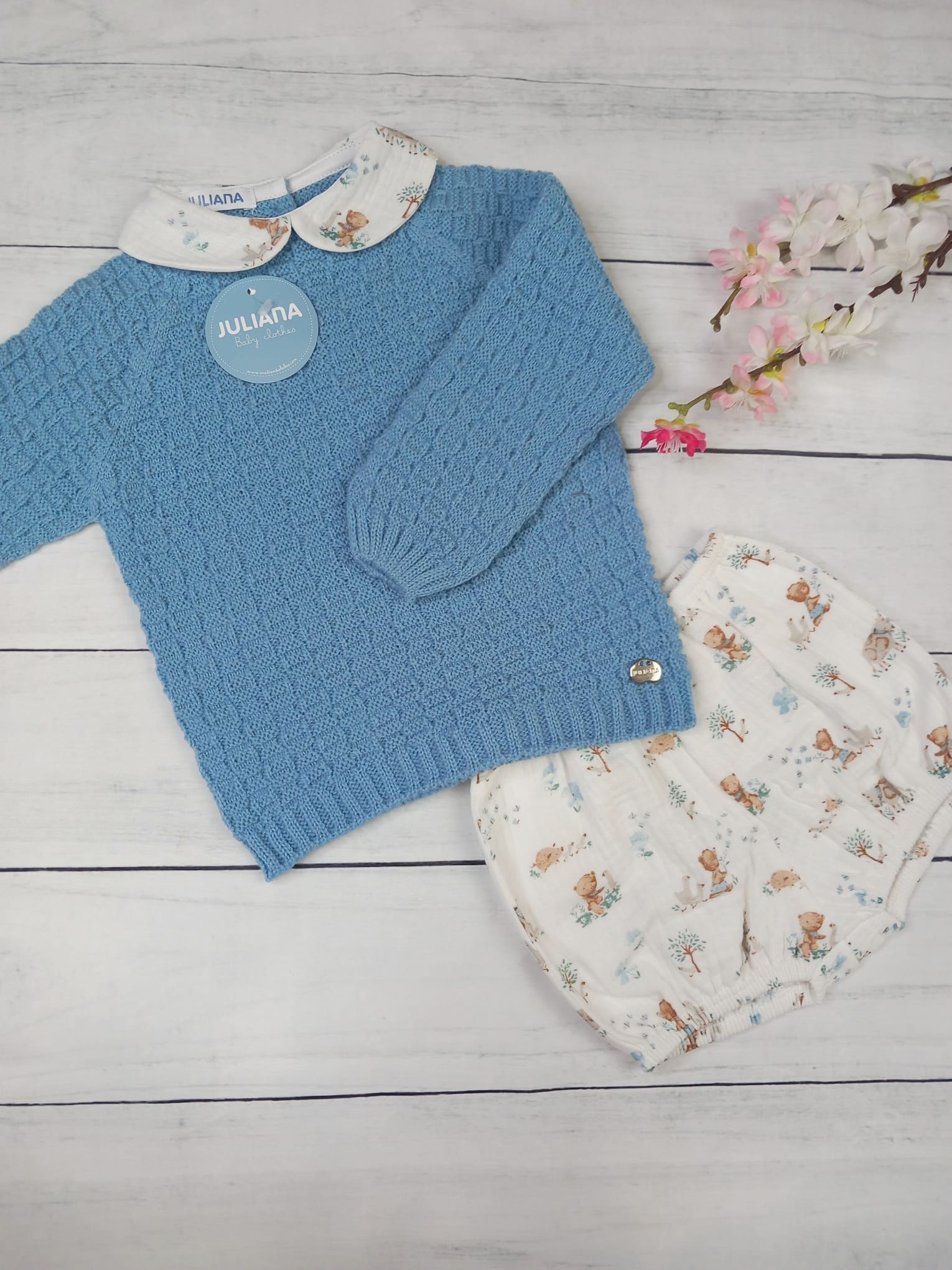 Ref. 25591Marca: Juliana bebésMedidas:T. 12m: jersey sisa 24 cm – manga desde cuello 31,5 cm – largo 29,5 cmbombacho tiro 19 cmT. 18m: jersey sisa 25 cm – manga desde cuello 32 cm – largo 30,5 cmbombacho tiro 21,5 cmT. 24m: jersey sisa 26 cm – manga desde cuello 35,5 cm – largo 31,5 cmbombacho tiro 23 cm