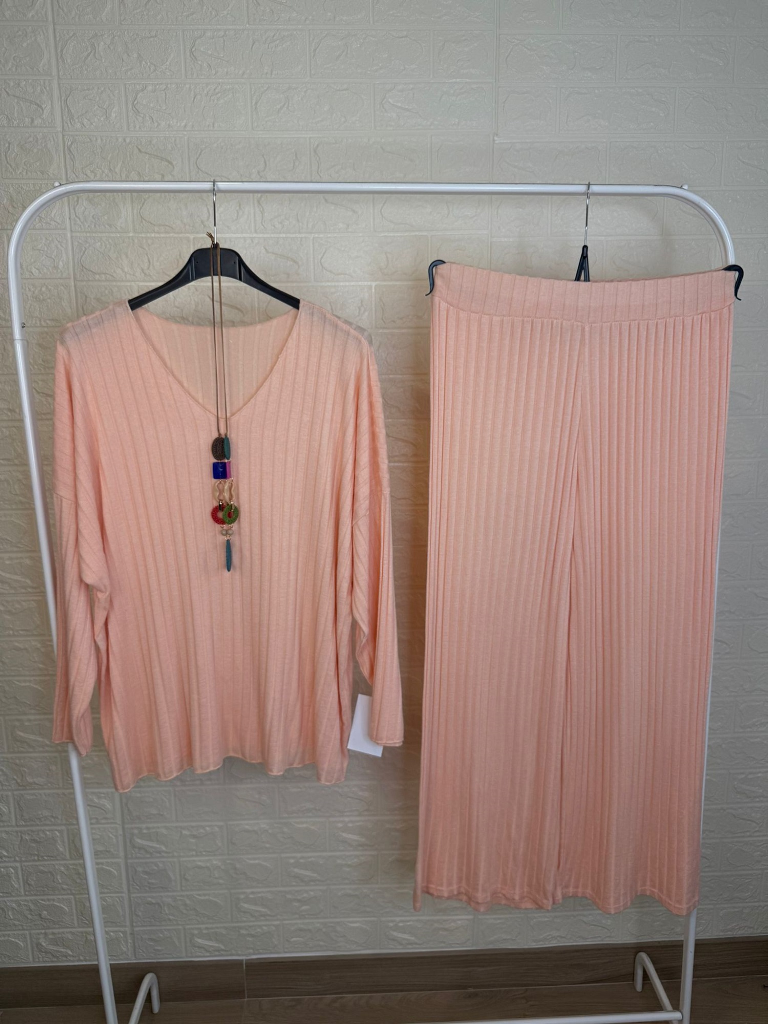 Conjunto de punto en canalé ancho. Escote en pico.