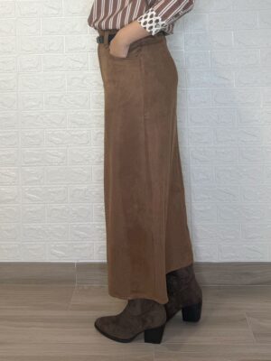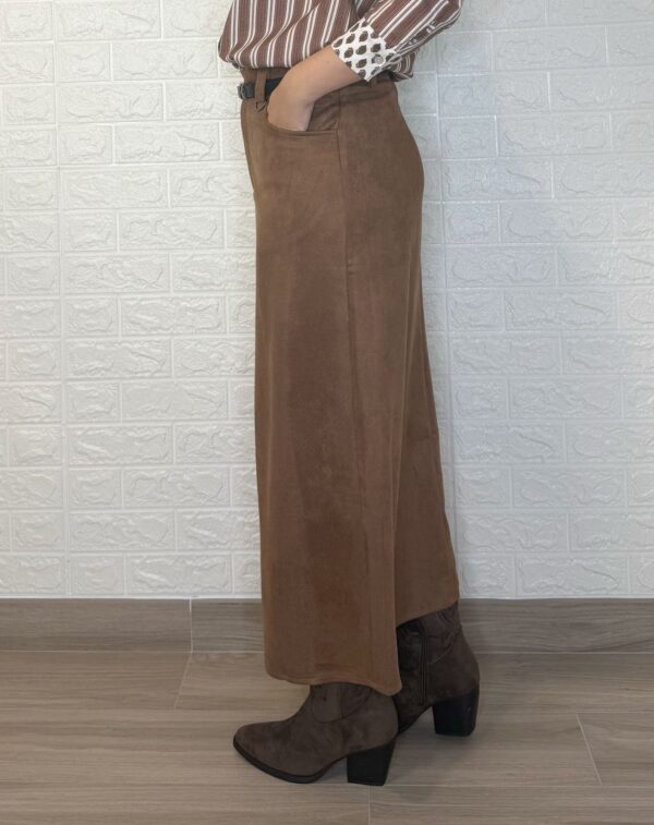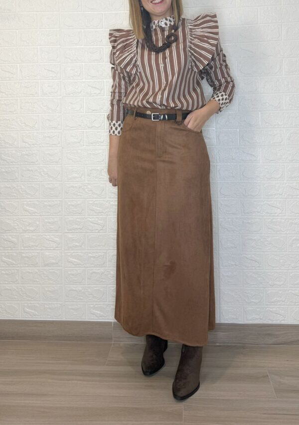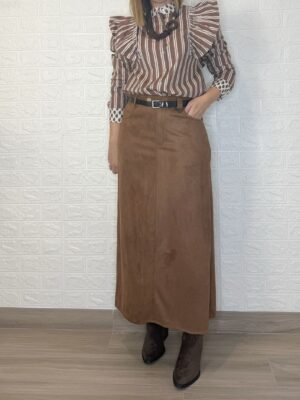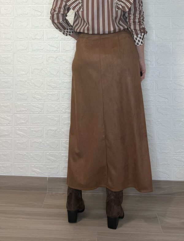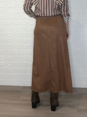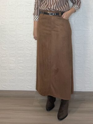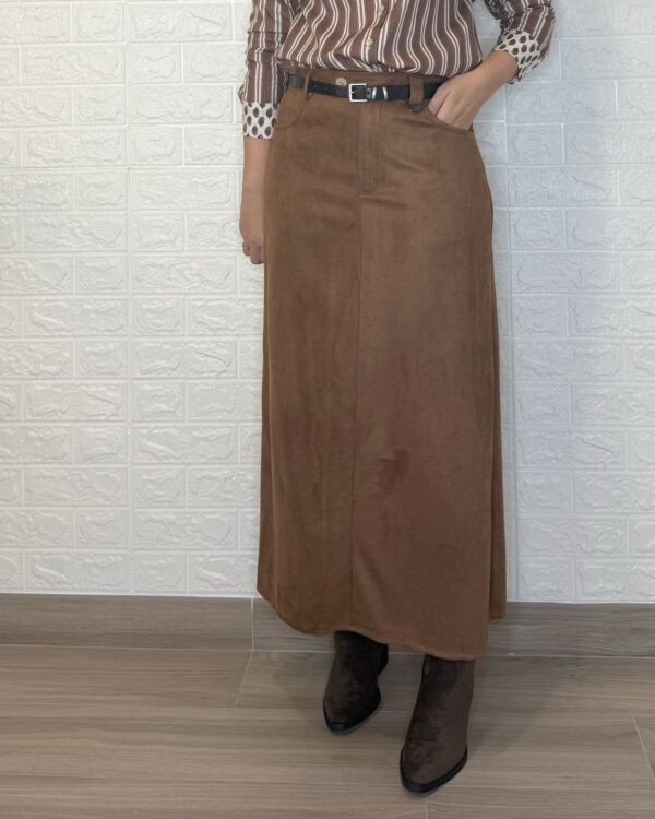 Falda de tejido de antelina. Tiene botón, cremallera y bolsillos. Incluye el cinturón.