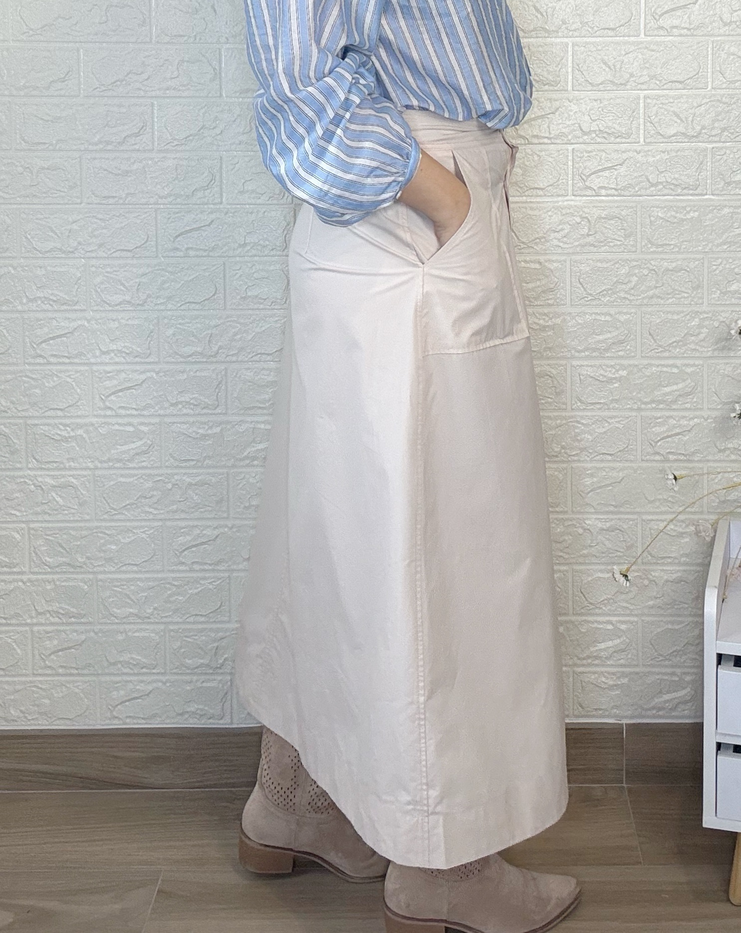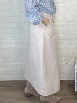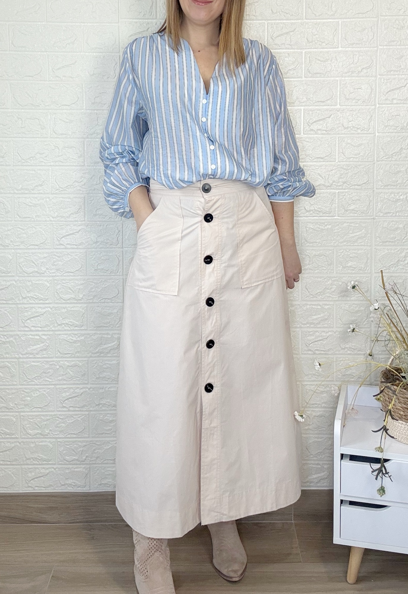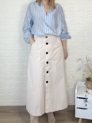 Falda con abertura de botones. Largo midi y bolsillos en la parte delantera.