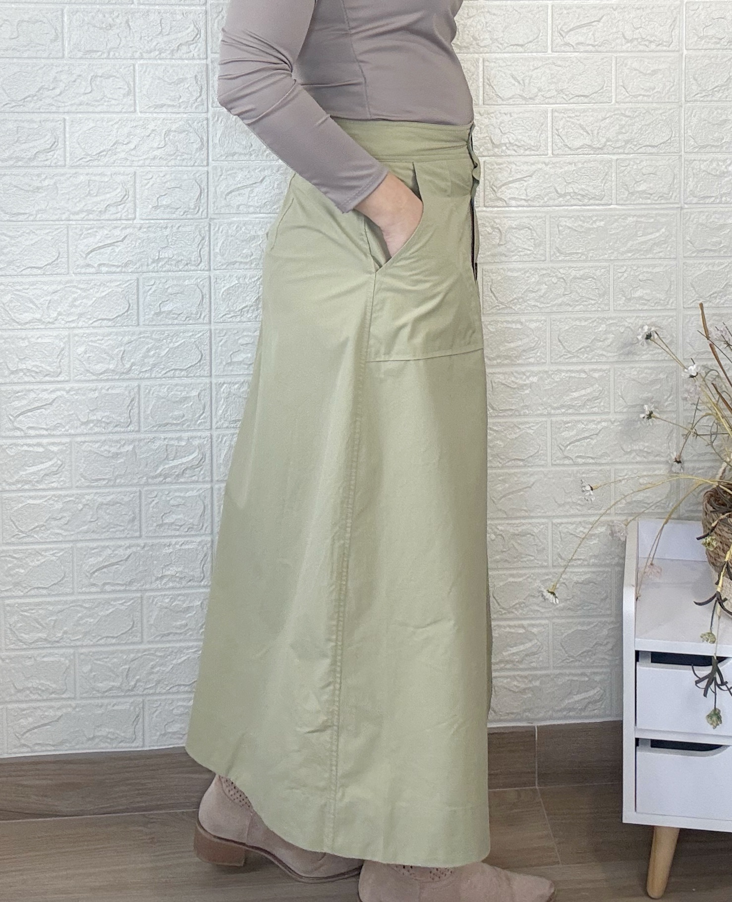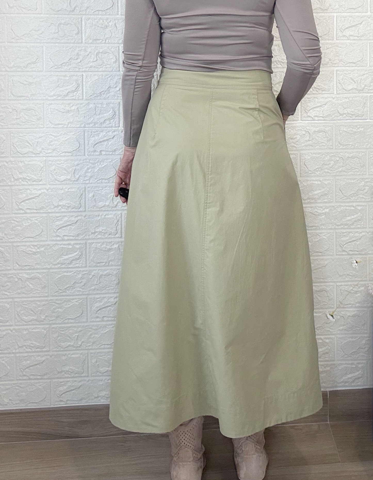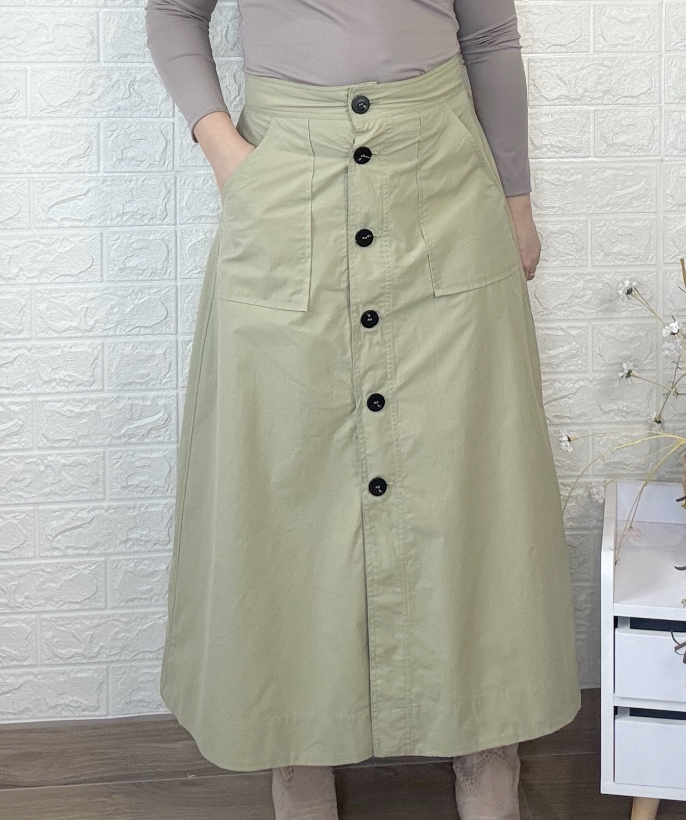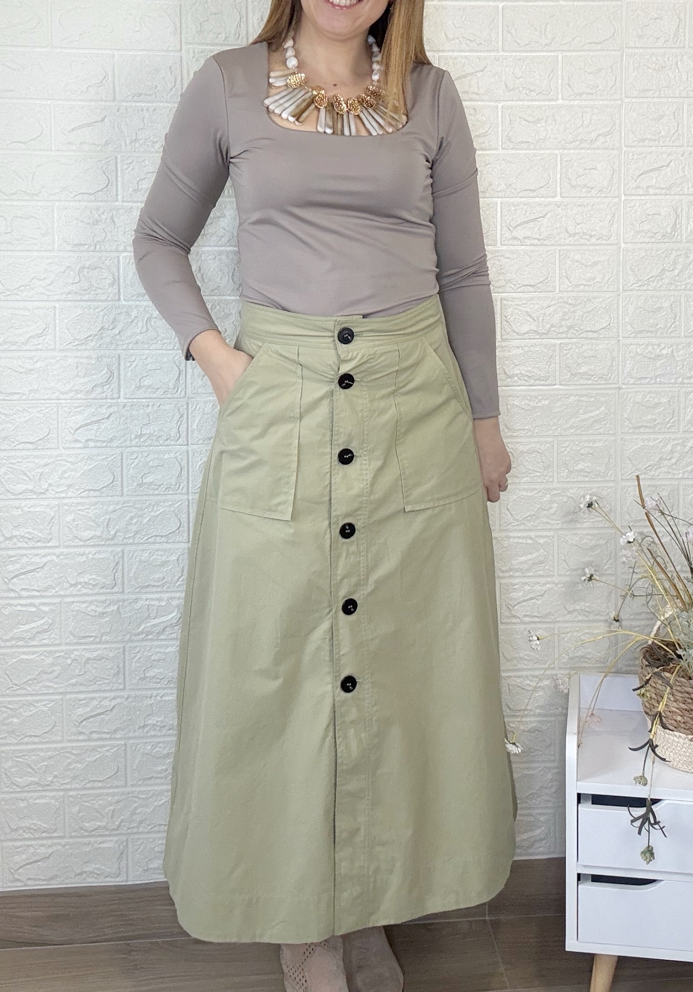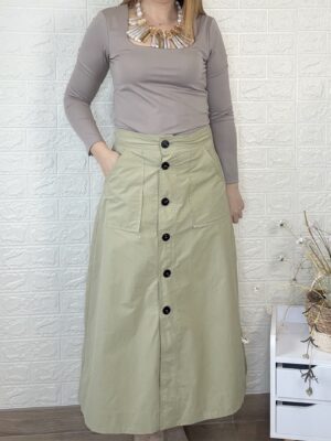 Falda con abertura de botones. Largo midi y bolsillos en la parte delantera.
