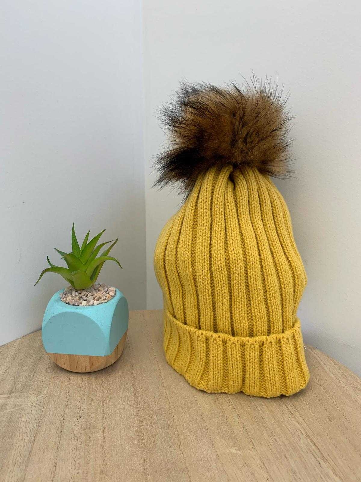 Sé el primero en revisar "Gorro canalé pompón pelo mostaza"