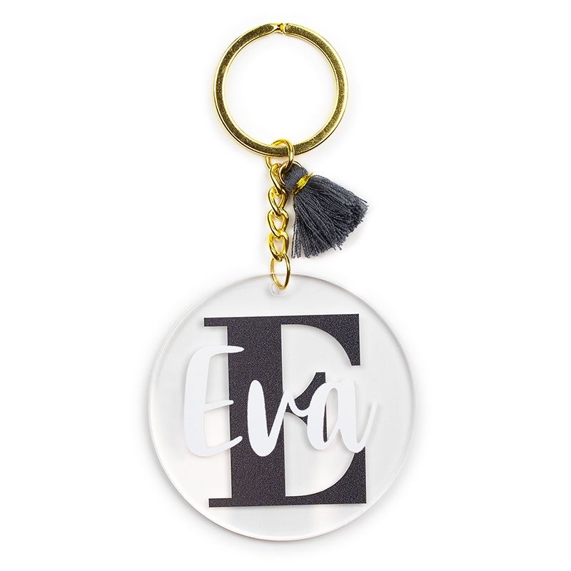 Los pedidos que contengan llavero se retrasarán aprox. 5 días porque hay que encargarlos.Se deben de abonar al hacer el pedido no válido contrareembolso.Poner nombre en observaciones.- Diámetro 58 mm- Material metacrilato transparente- Incluye cadena y anilla dorada para colgar con pompon de color a juego con la inicial- Se personaliza con vinilo adhesivo y la tipografía que se ve en la imagen.- Máximo 10 caracteres en 1 línea