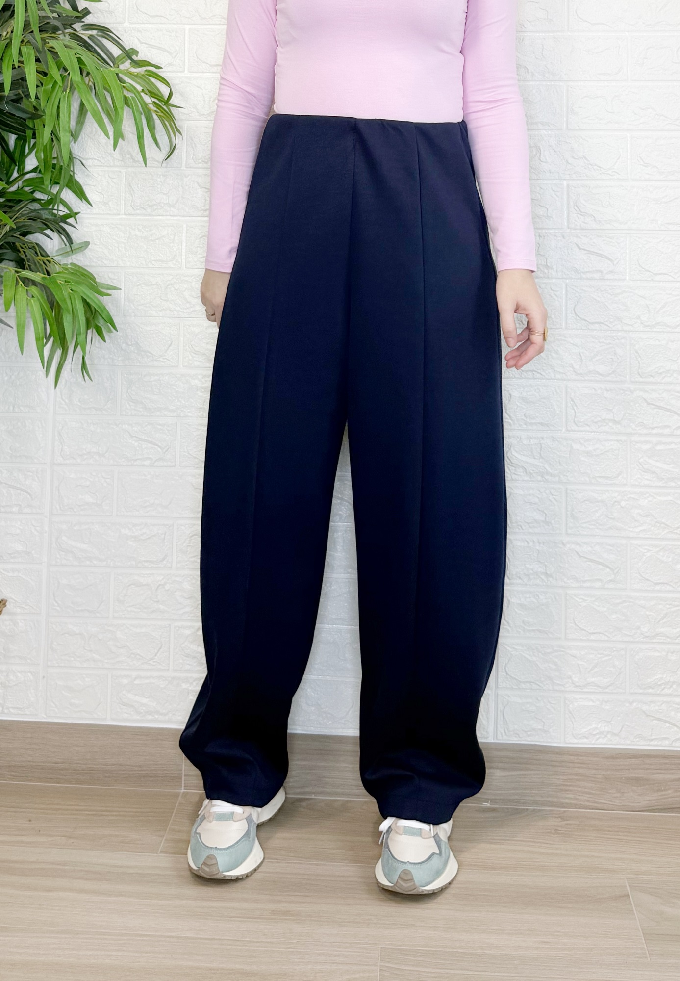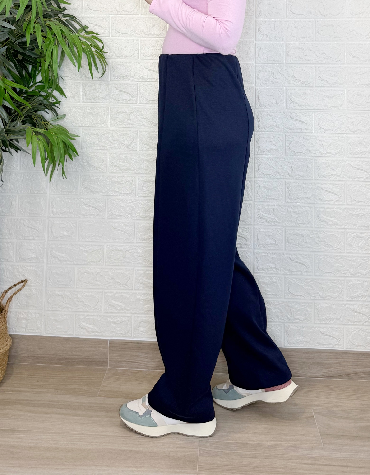 Tiene goma en cintura y costura en la parte delantera.