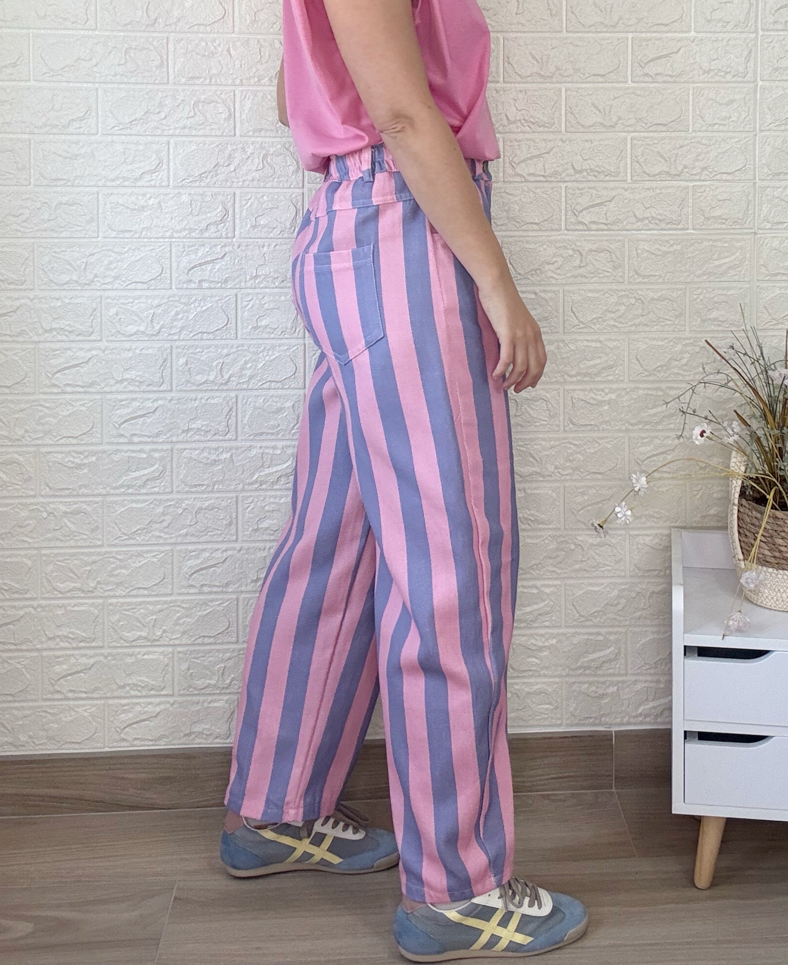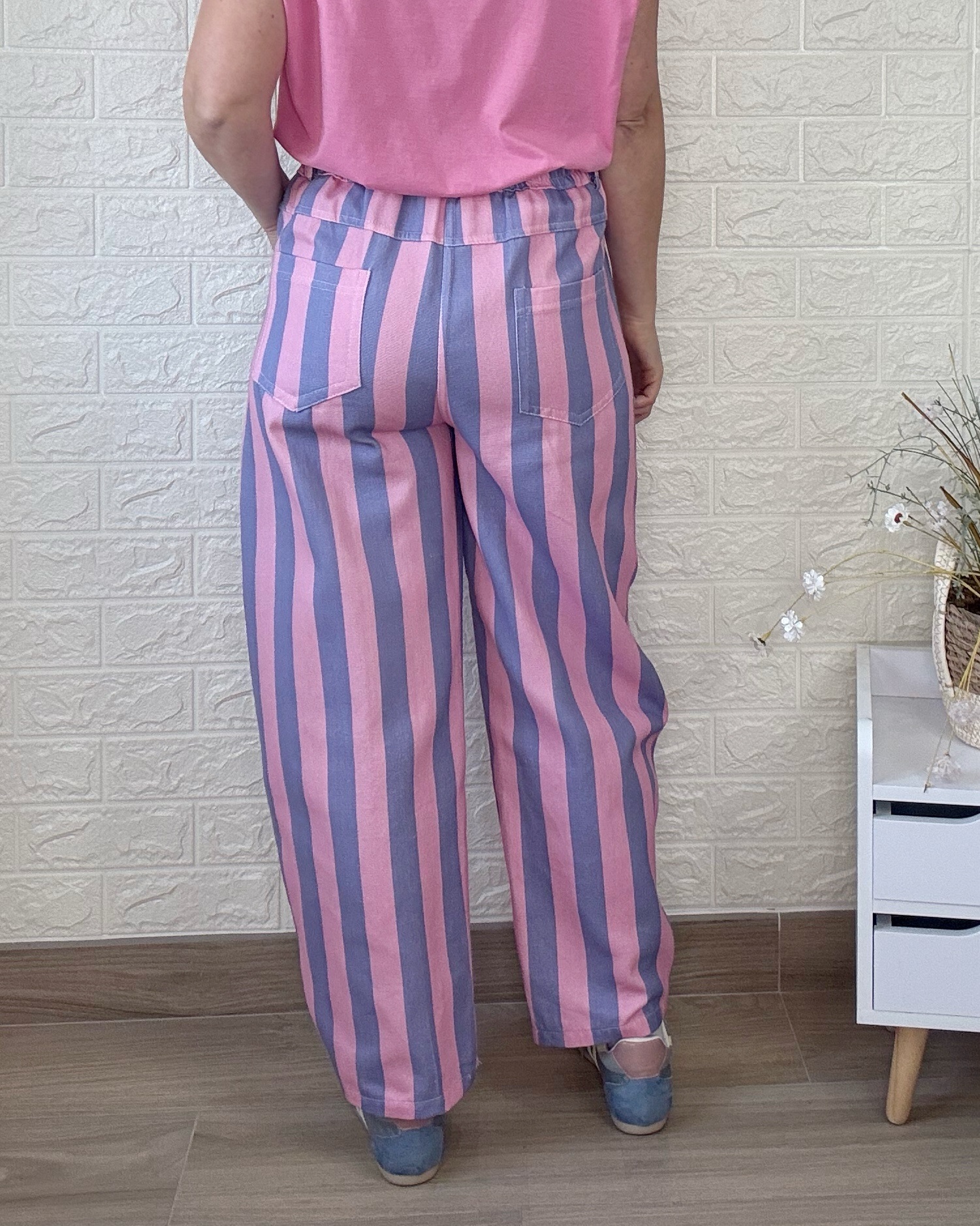 Tiene goma en la parte de atrás de la cintura y bolsillos.