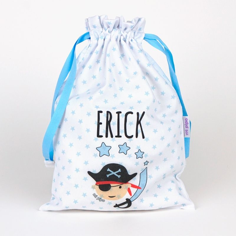Poner el nombre en observacionesAl ser un artículo personalizado no se puede devolver – Fabricados en España – Tejido de piqué canutillo 100% algodón – Cierre con cintas – Diseño de Pirata estampado – Apto para lavadora – Medidas aprox: 34x24cm – Máximo 20 caracteres en dos líneas