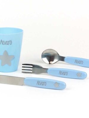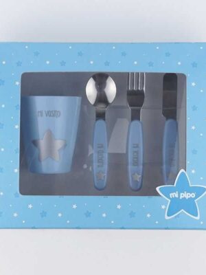 Set vasito y cubiertos acero personalizados azulCaracterísticas- Incluye vasito cuchara tenedor y cuchillo.- Libres de BPA- Cubiertos de acero inoxidable- Sin melamina- Aptos para lavavajillas (bandeja superior)- Vasito apto para microondas capacidad 200ml- Diseño original Mi Pipo- A partir de 24 meses Personalización- Se personaliza con el tipo de letra que se ve en la imagen- Máximo 10 caracteres