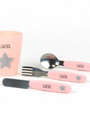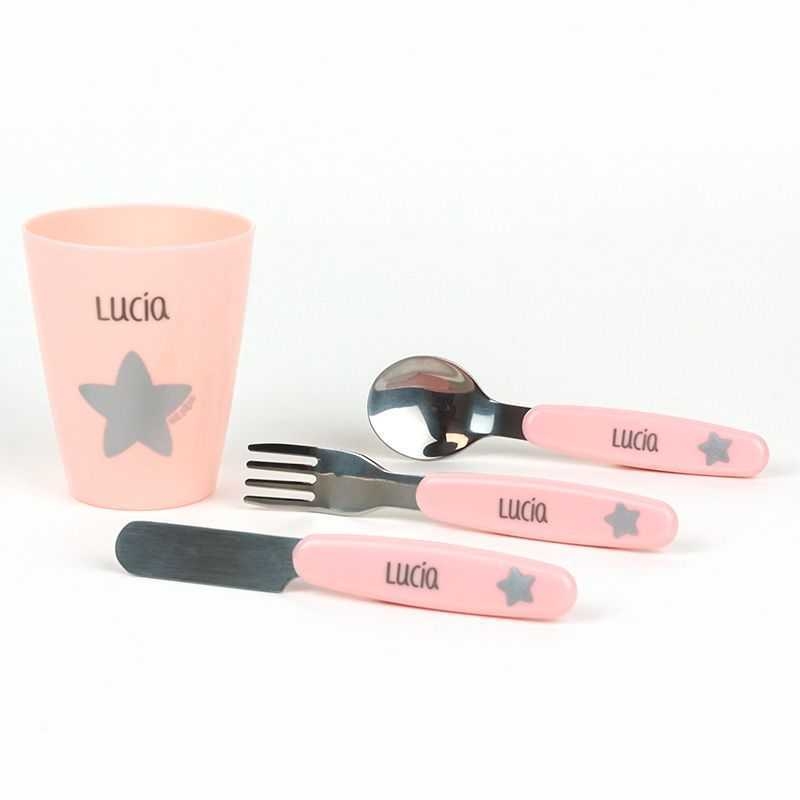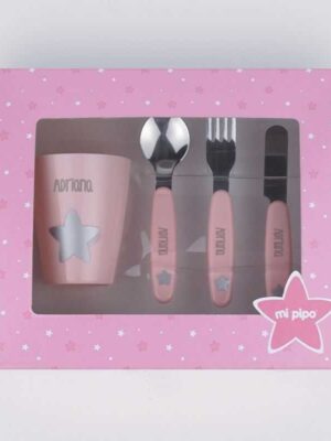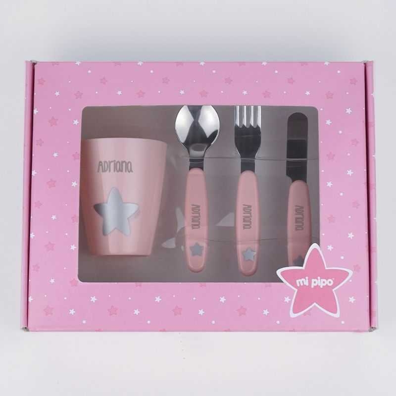 Set vasito y cubiertos acero personalizados rosaCaracterísticas- Incluye vasito cuchara tenedor y cuchillo.- Libres de BPA- Cubiertos de acero inoxidable- Sin melamina- Aptos para lavavajillas (bandeja superior)- Vasito apto para microondas capacidad 200ml- Diseño original Mi Pipo- A partir de 24 meses Personalización- Se personaliza con el tipo de letra que se ve en la imagen- Máximo 10 caracteres