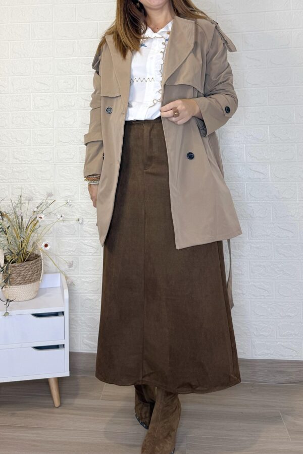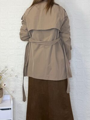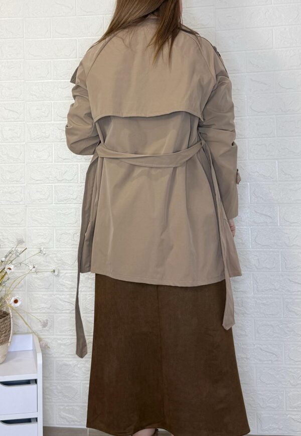 Trench de entretiempo. Cierre con botones y tiene cinturón.