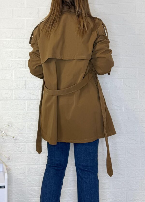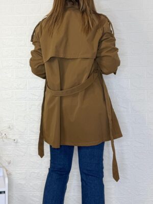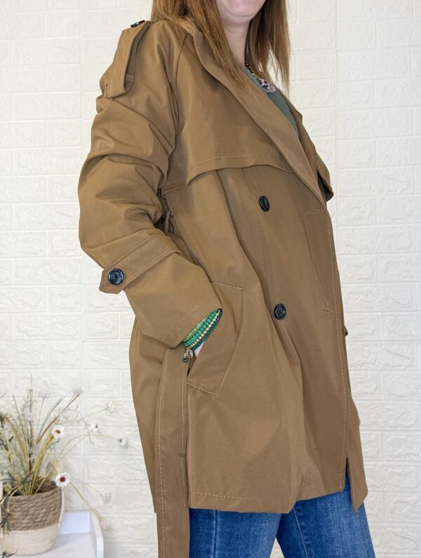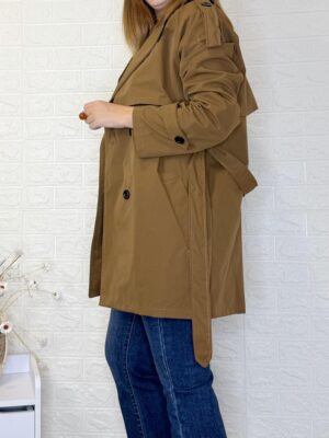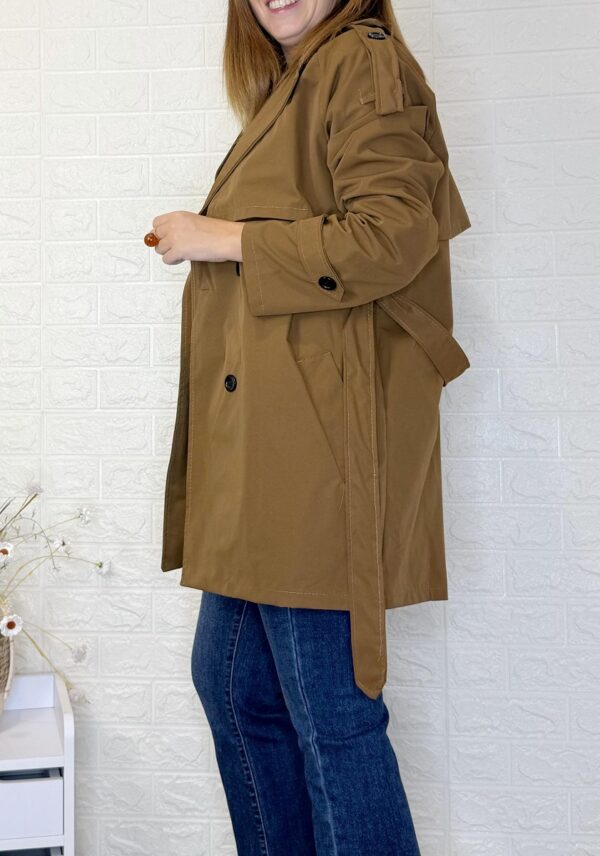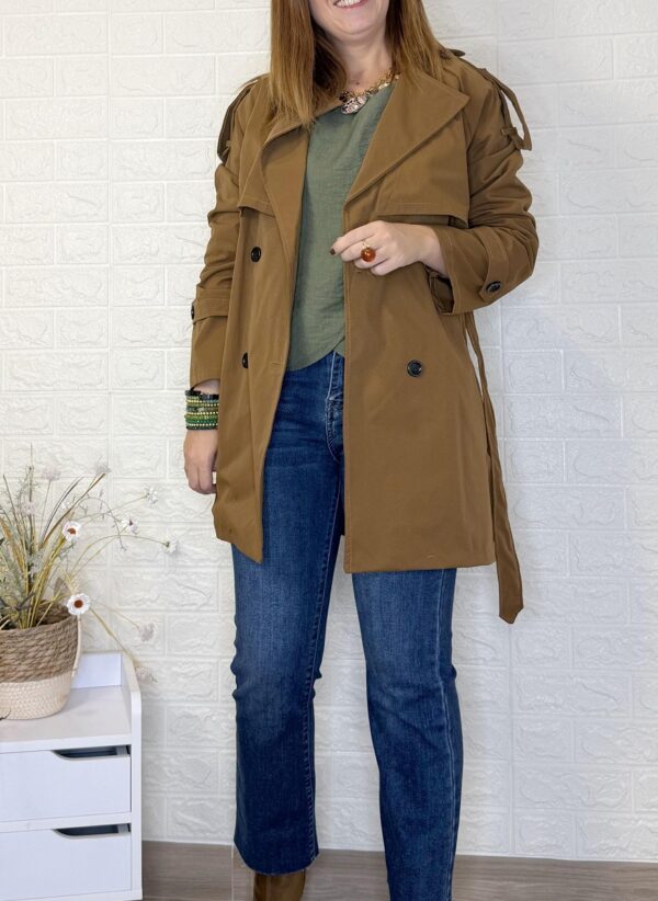 Trench de entretiempo. Cierre con botones y tiene cinturón.